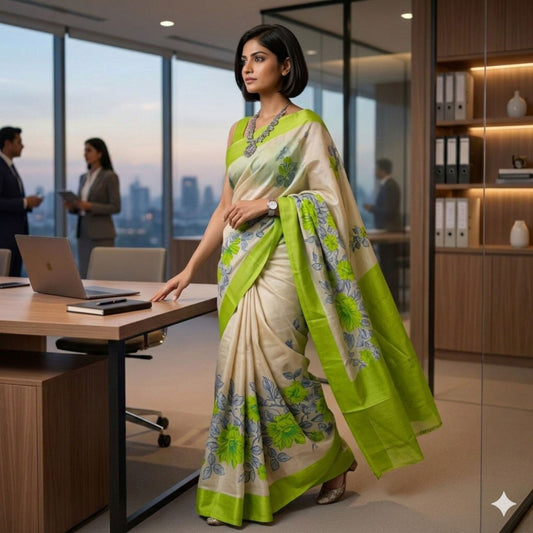 Beige And Green Handpainted Tussar Silk Saree
