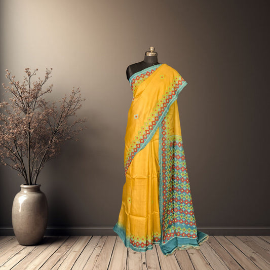 Yellow Tussar Silk Gujarati Stitch Saree