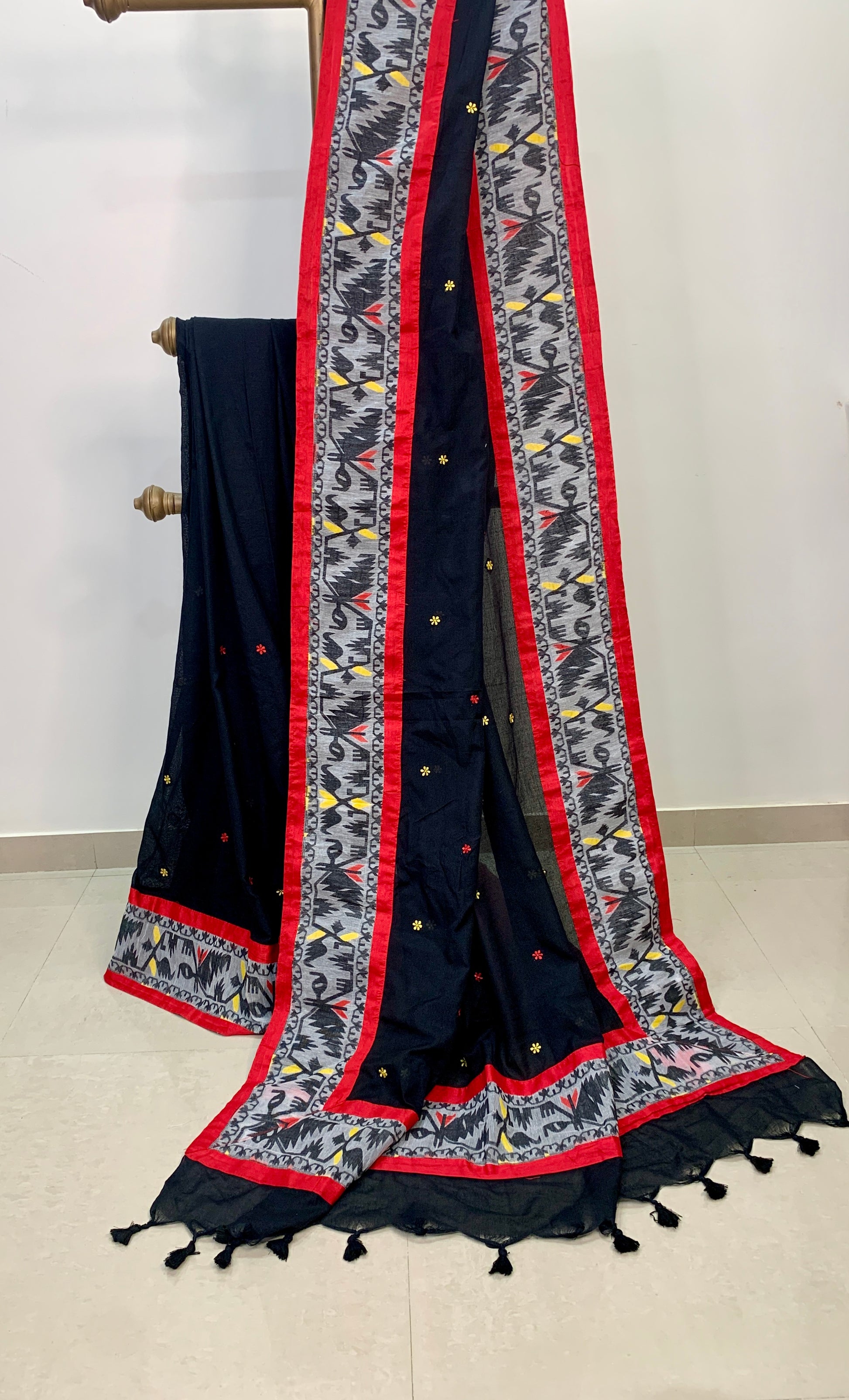 Color & Design : This saree is a designer piece from Aananda Collections, featuring multi colour embroidered butas through out the saree. White Jamdani border with Red piping gives the saree a unique look. the saree has a blouse piece with embroidery on the sleeves. Fabric : Mixed cotton Length : 5.5 meters approx. 1 meter Black Colour Blouse piece with embroidery
