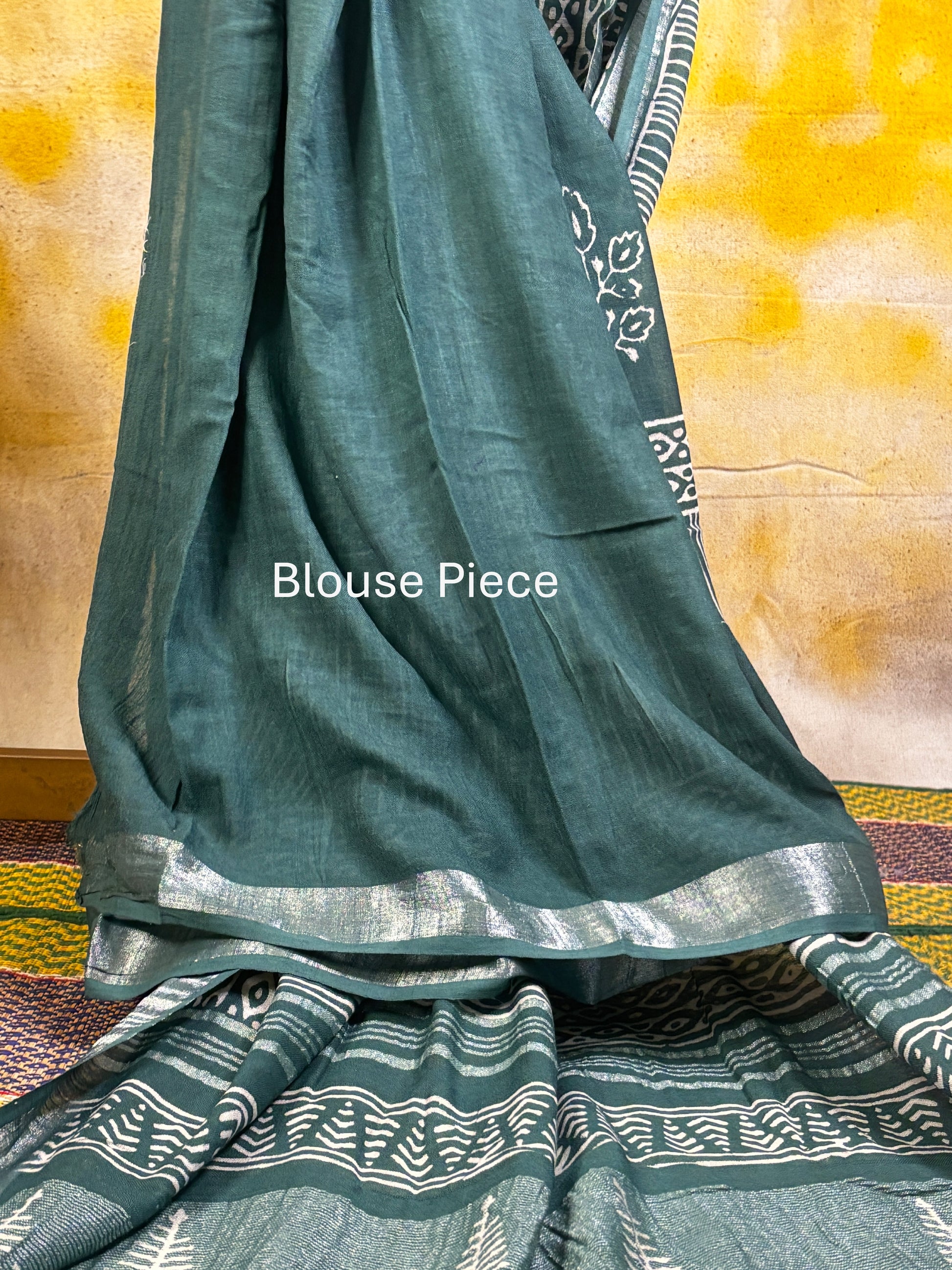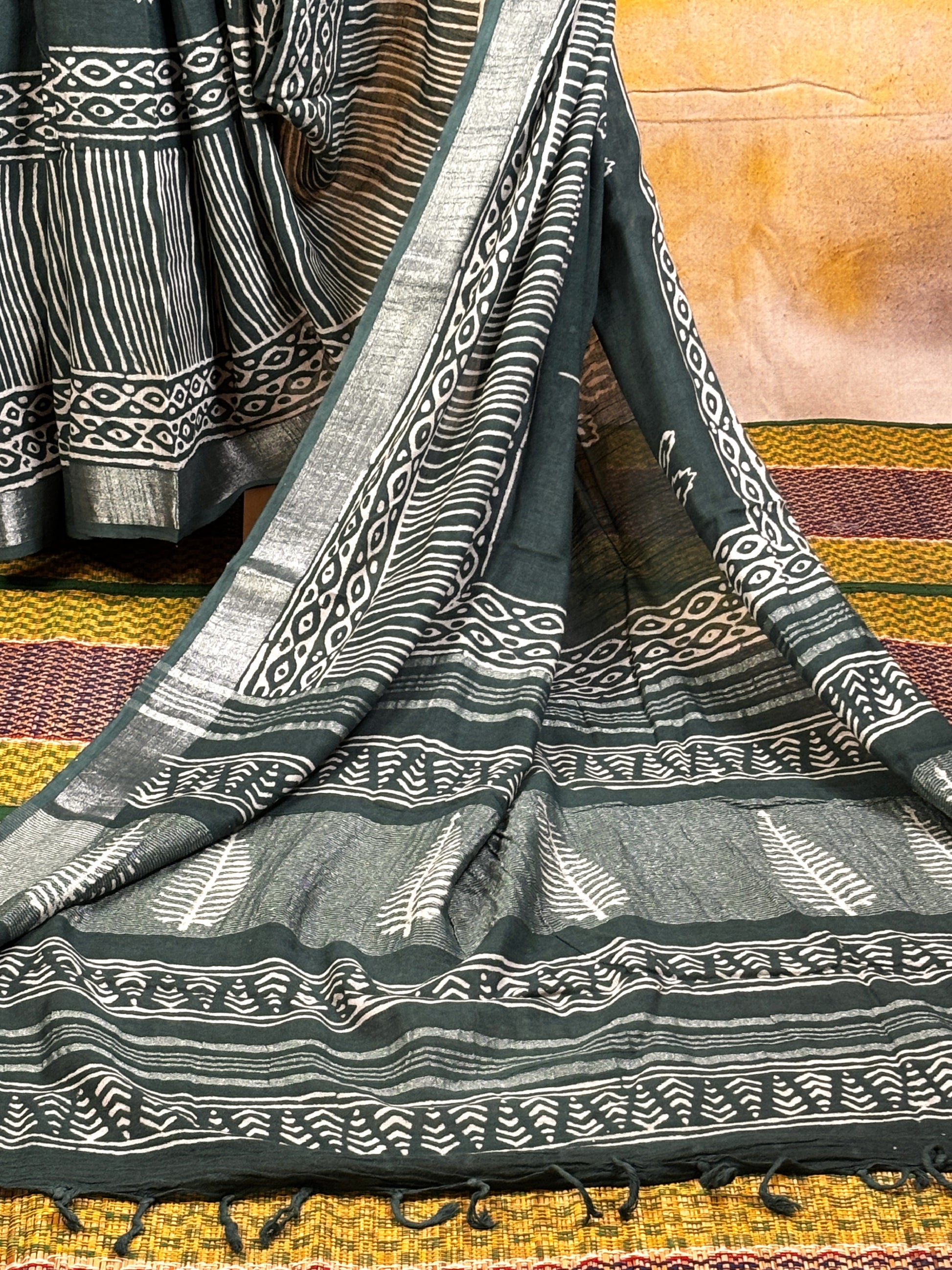 Color & Design: This expertly crafted Green and White Linen Saree is made from handloom linen and features a unique hand block print. It has silver border. The saree comes with a plain blouse piece with silver border. Elevate your wardrobe with this beautiful and versatile saree.