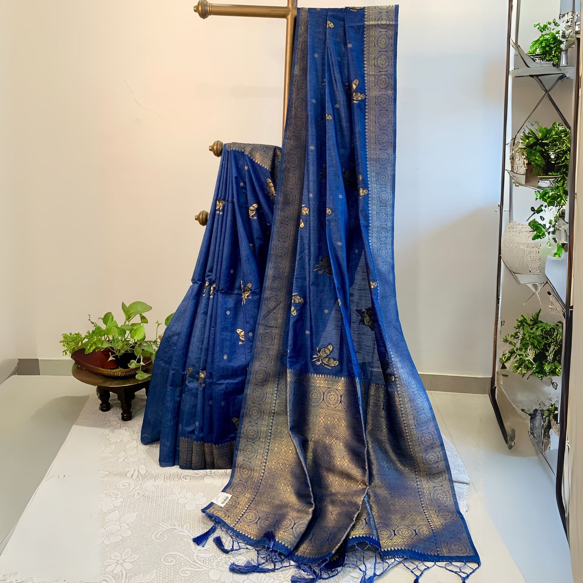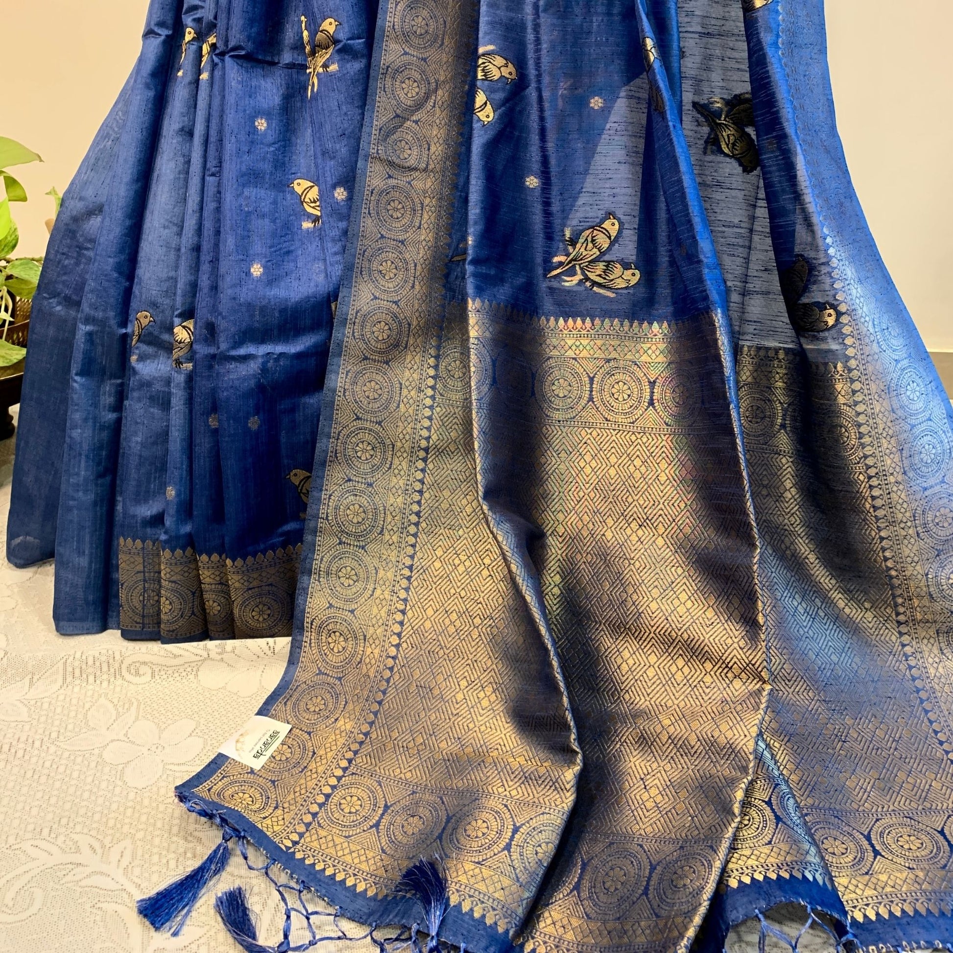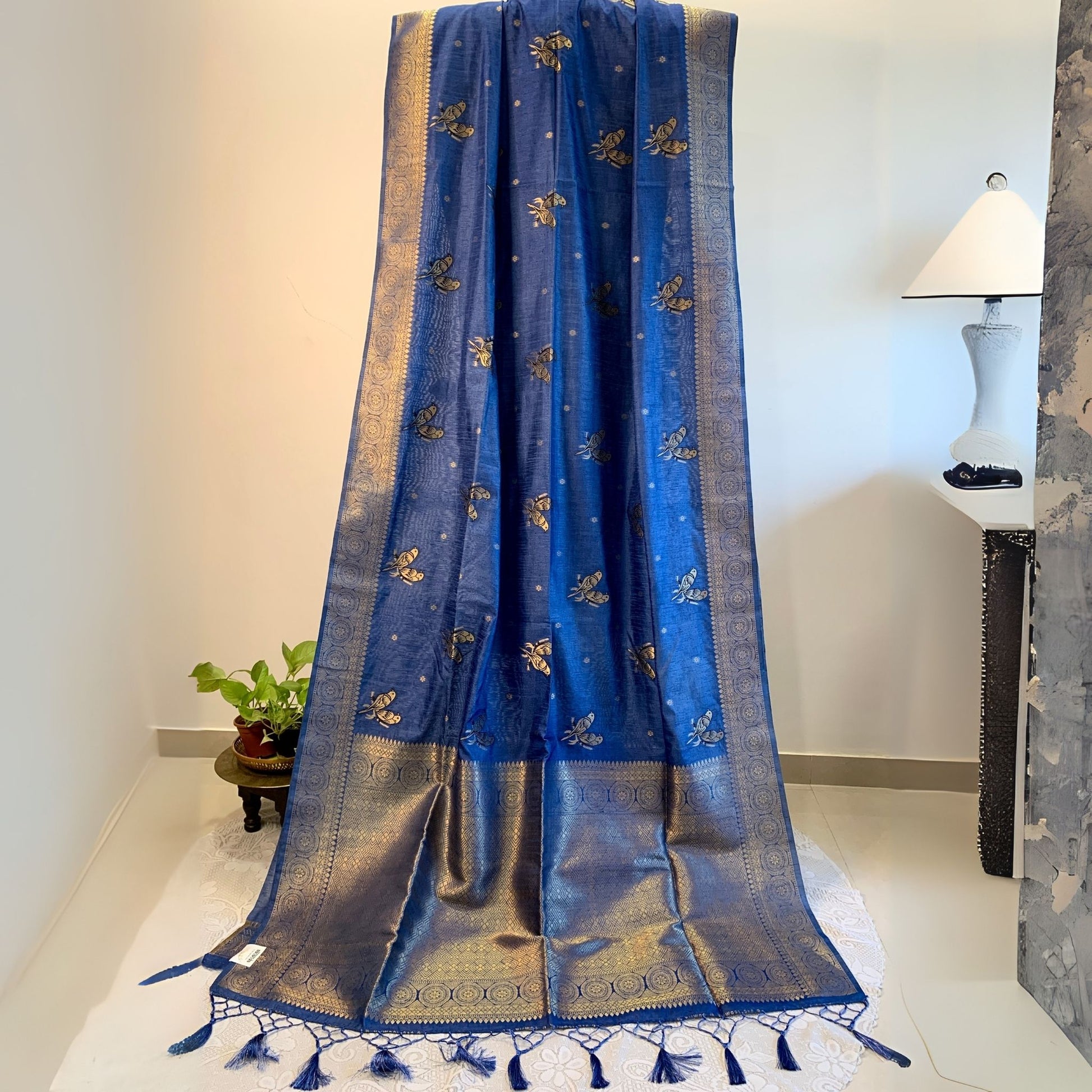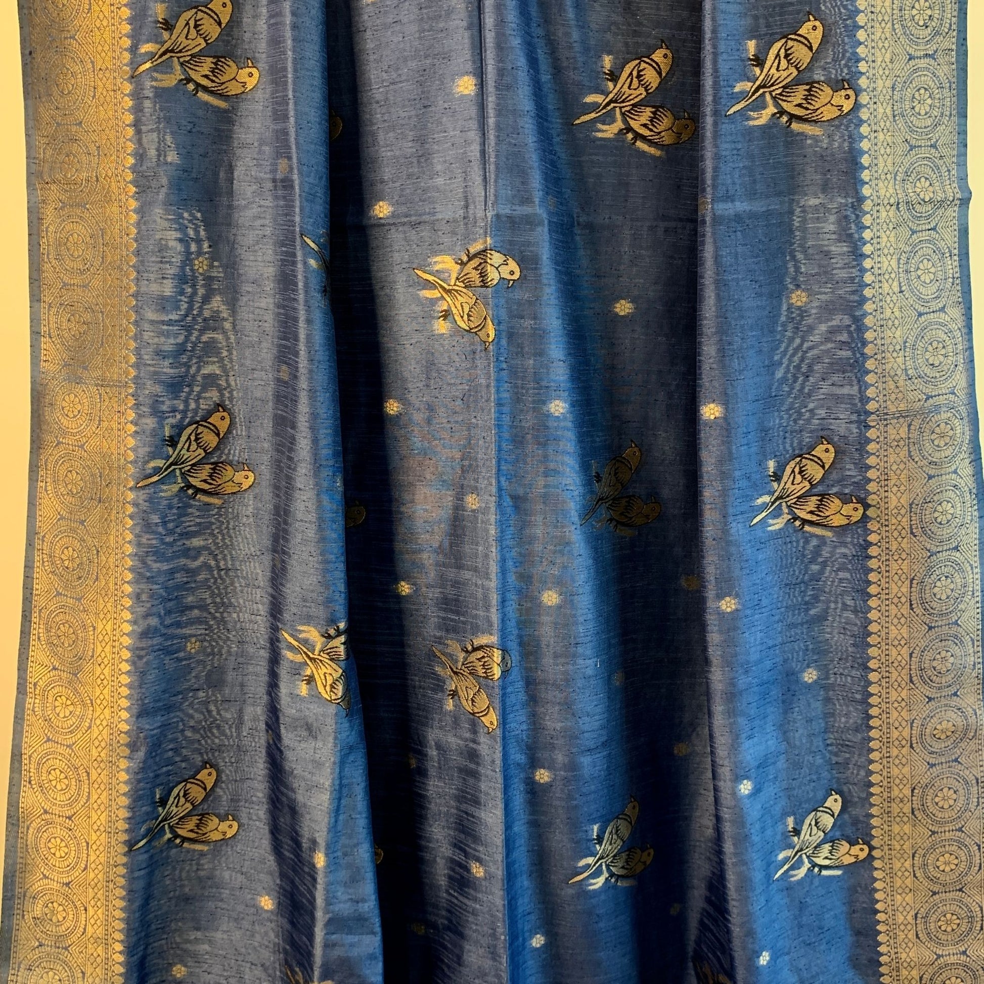 Color & Design: Expertly crafted with a combination of Cobalt Blue Dola Silk and Golden zari border, this saree features a beautiful Golden Bird motif woven throughout. Its unique design is perfect for festivals and special occasions, making it an elegant addition to any wardrobe.