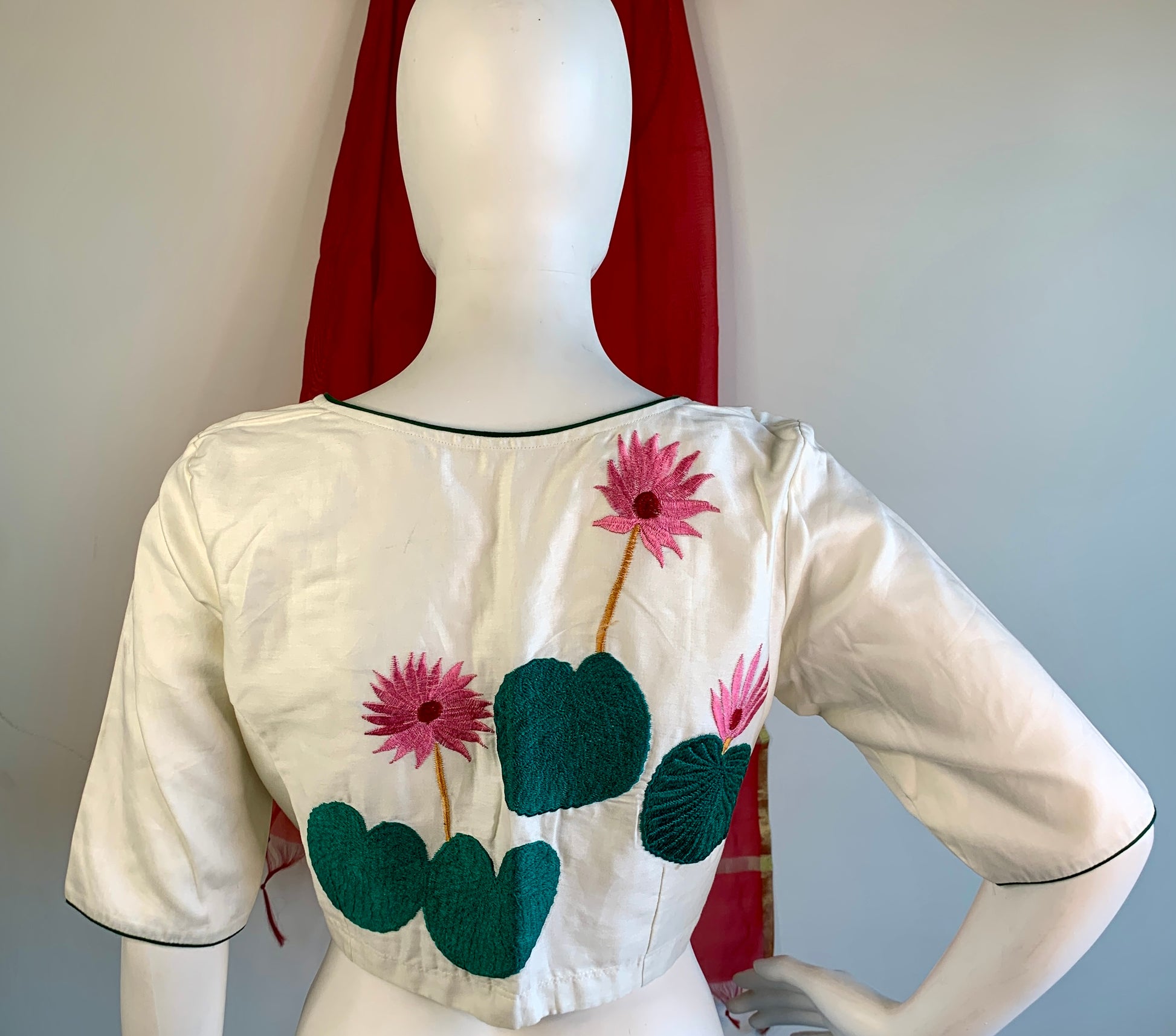 Description & Colour :Expertly crafted, the Silk Cotton Blouse is both stylish and comfortable. The multi-colour machine embroidery design adds a touch of elegance while the Green piping on the sleeves adds a pop of color. Pair it with any saree for a stunning look.