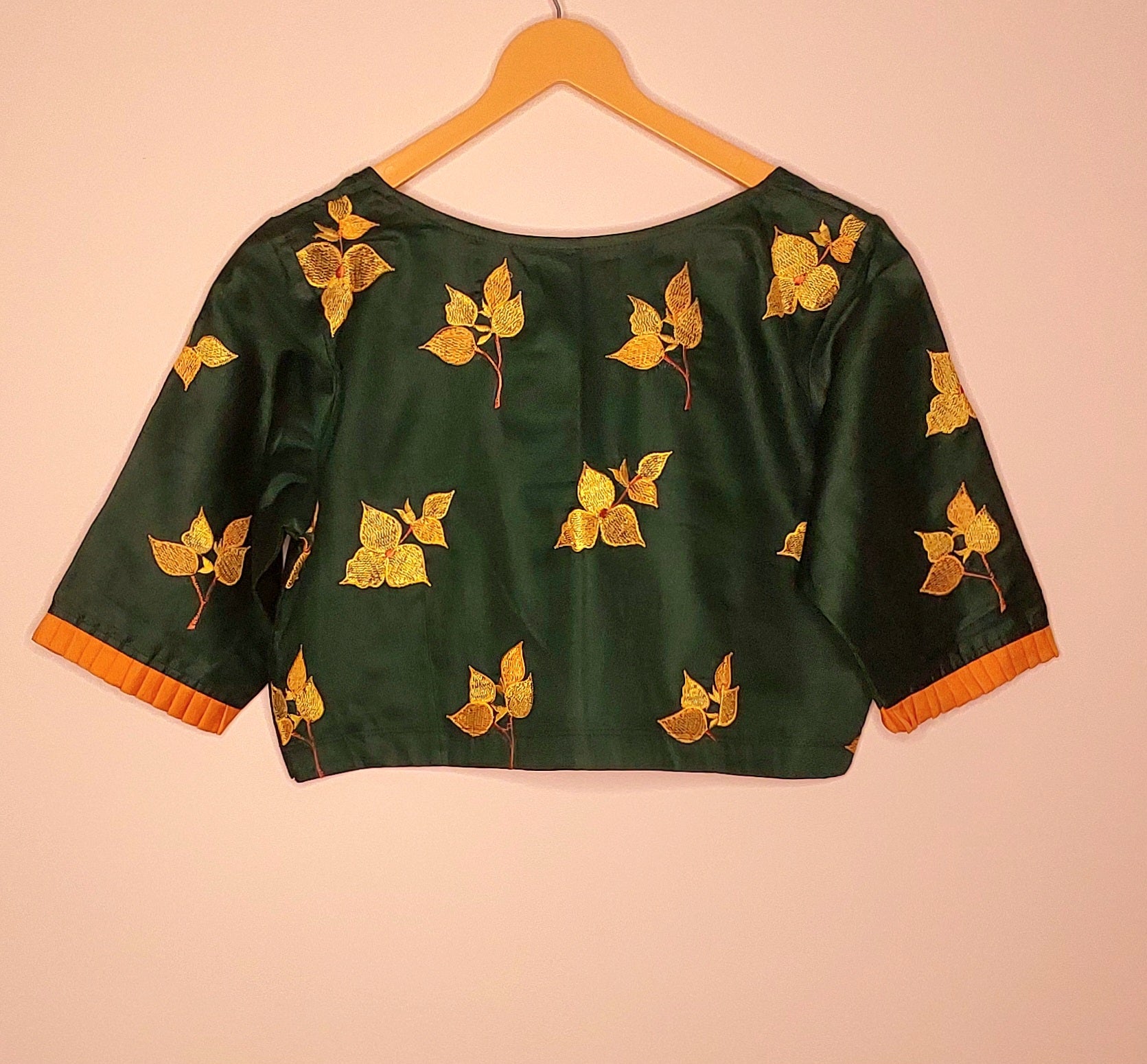 Description & Colour :Expertly crafted, the Emerald Green Silk Cotton Blouse is both stylish and comfortable. The Yellow colour machine embroidery design adds a touch of elegance and the Yellow piping on the sleeves adds a pop of color. Pair it with any saree for a stunning look.