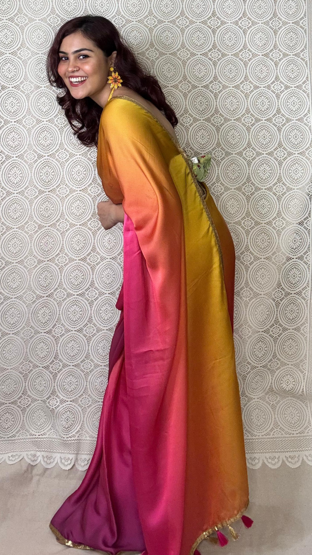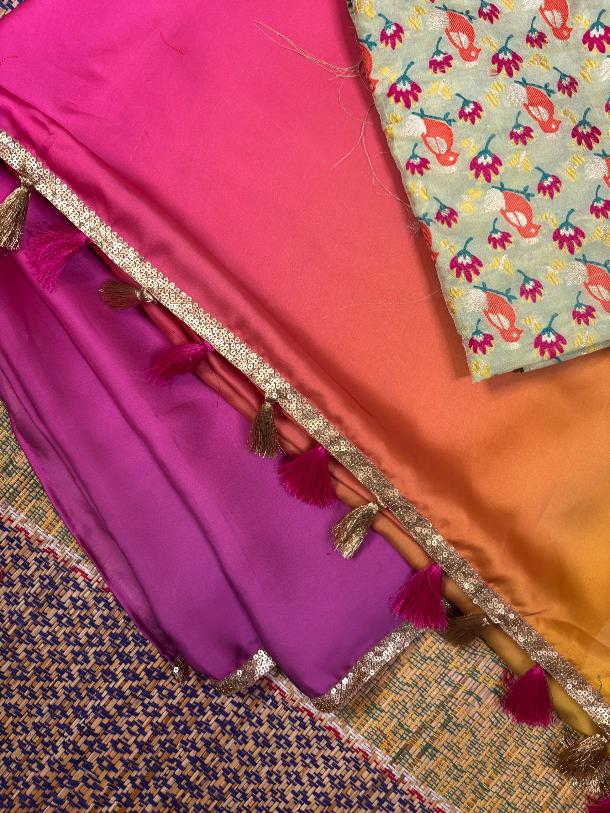 A very stylish saree, ideal for parties, can be worn with a backless halter or go for a structured off-shoulder, one-shoulder, or corset-style blouse in light green or metallic gold. Color & Design : A saree with a beautiful gradient of yellow, orange, and pink hues, featuring a golden sequined border and golden latkan details on the pallu. The contrast light green brocade blouse piece adds a refreshing pop of colour.