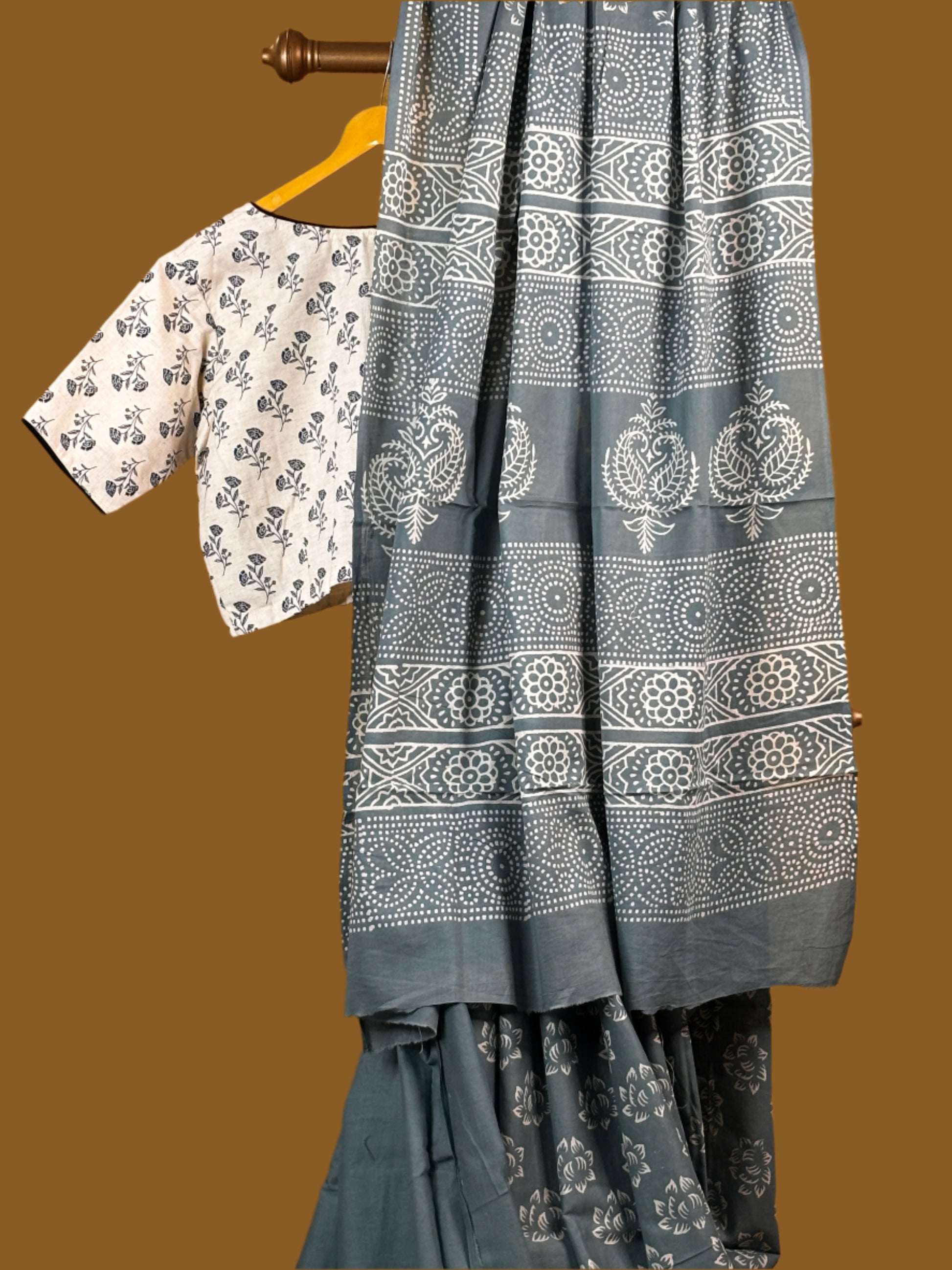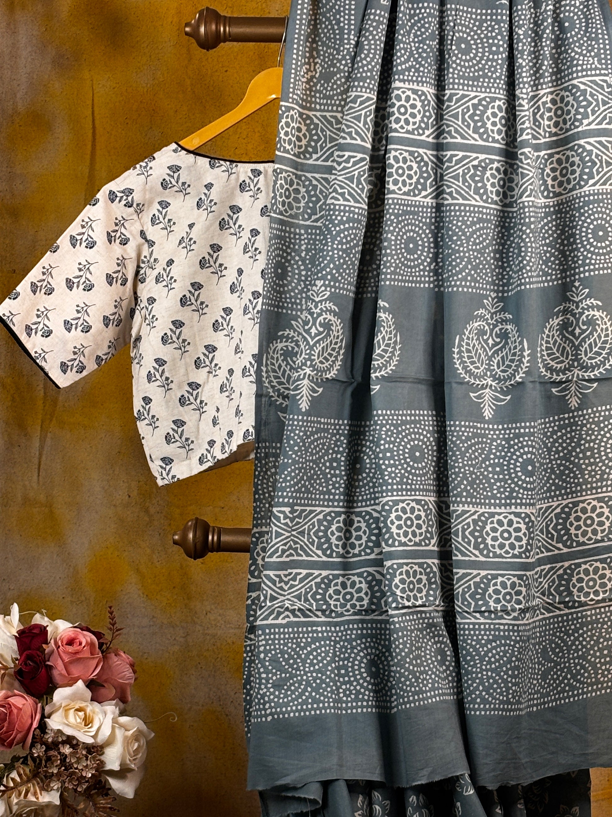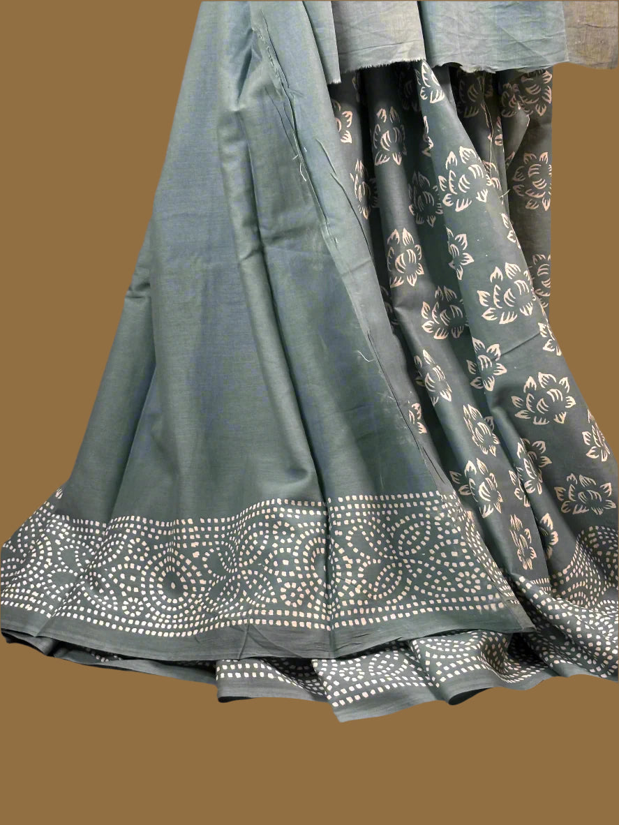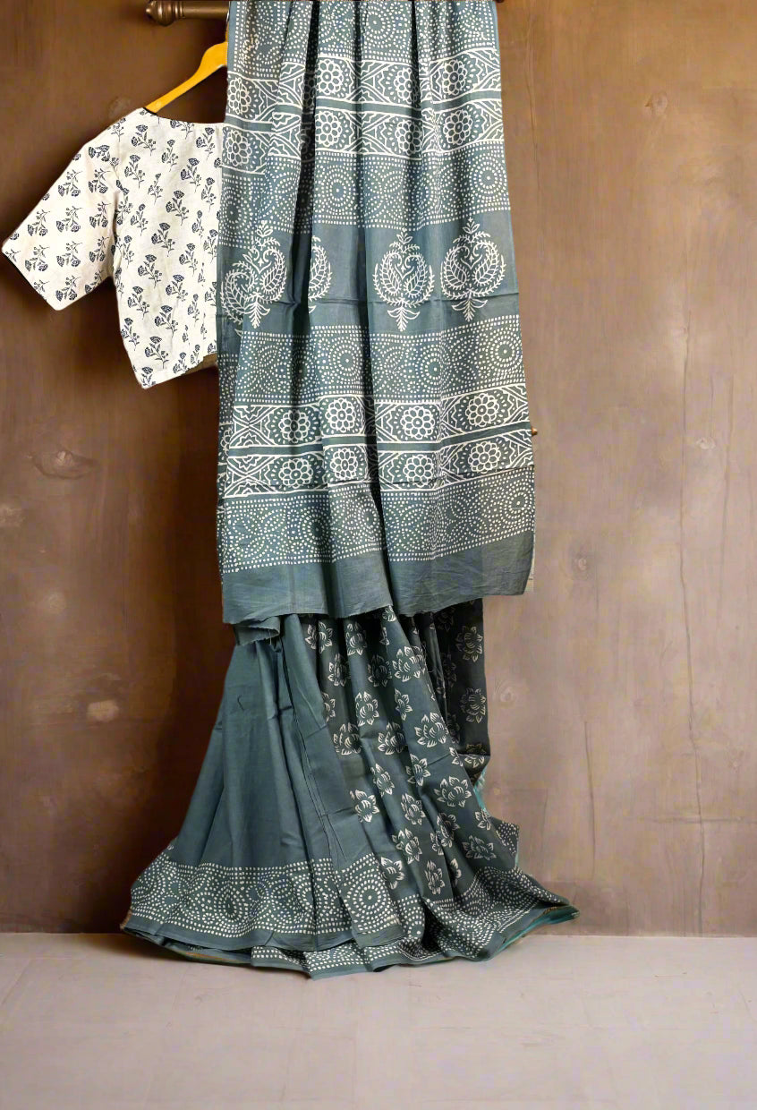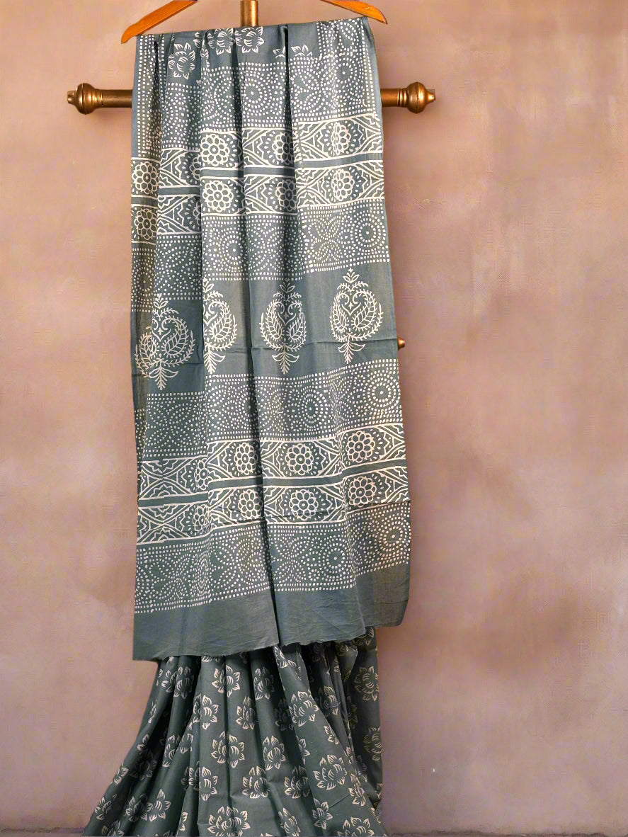 Grey and White Mul Mul Cotton Block Printed Saree