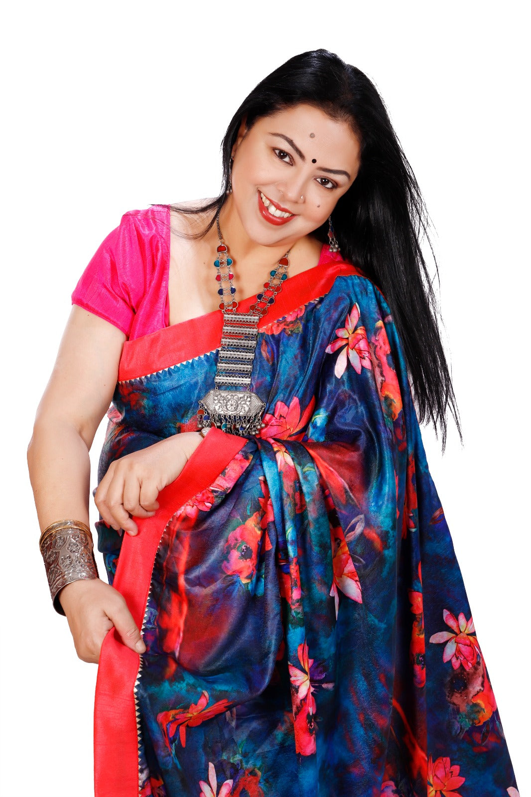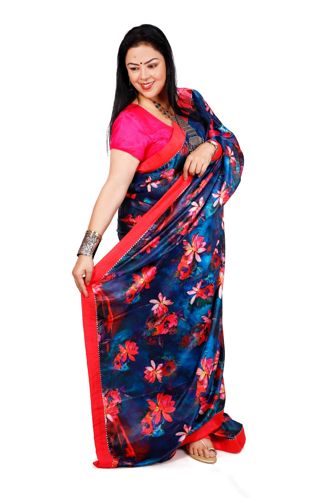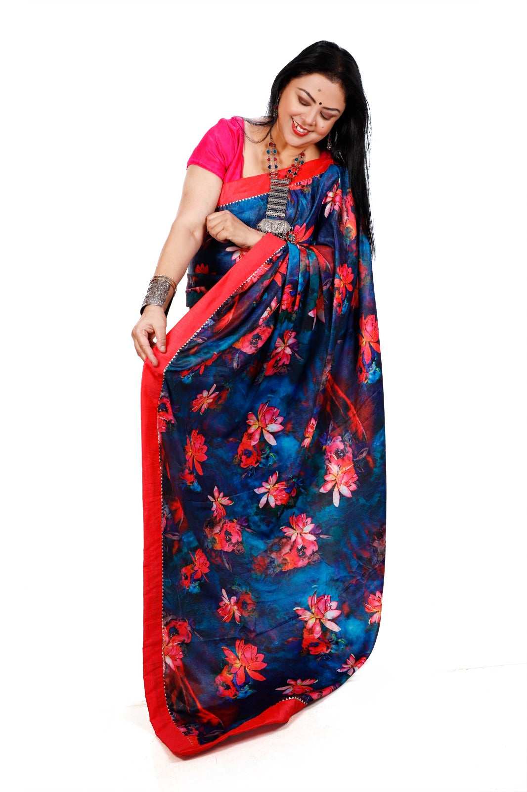 Color & Design :Exquisite Prussian Blue satin georgette saree featuring sophisticated lotus motif digital prints. The contrasting pink border is accentuated with a refined metallic silver trim. This saree combines luxurious softness with elegant styling, making it an impeccable choice for upscale gatherings and special occasions.