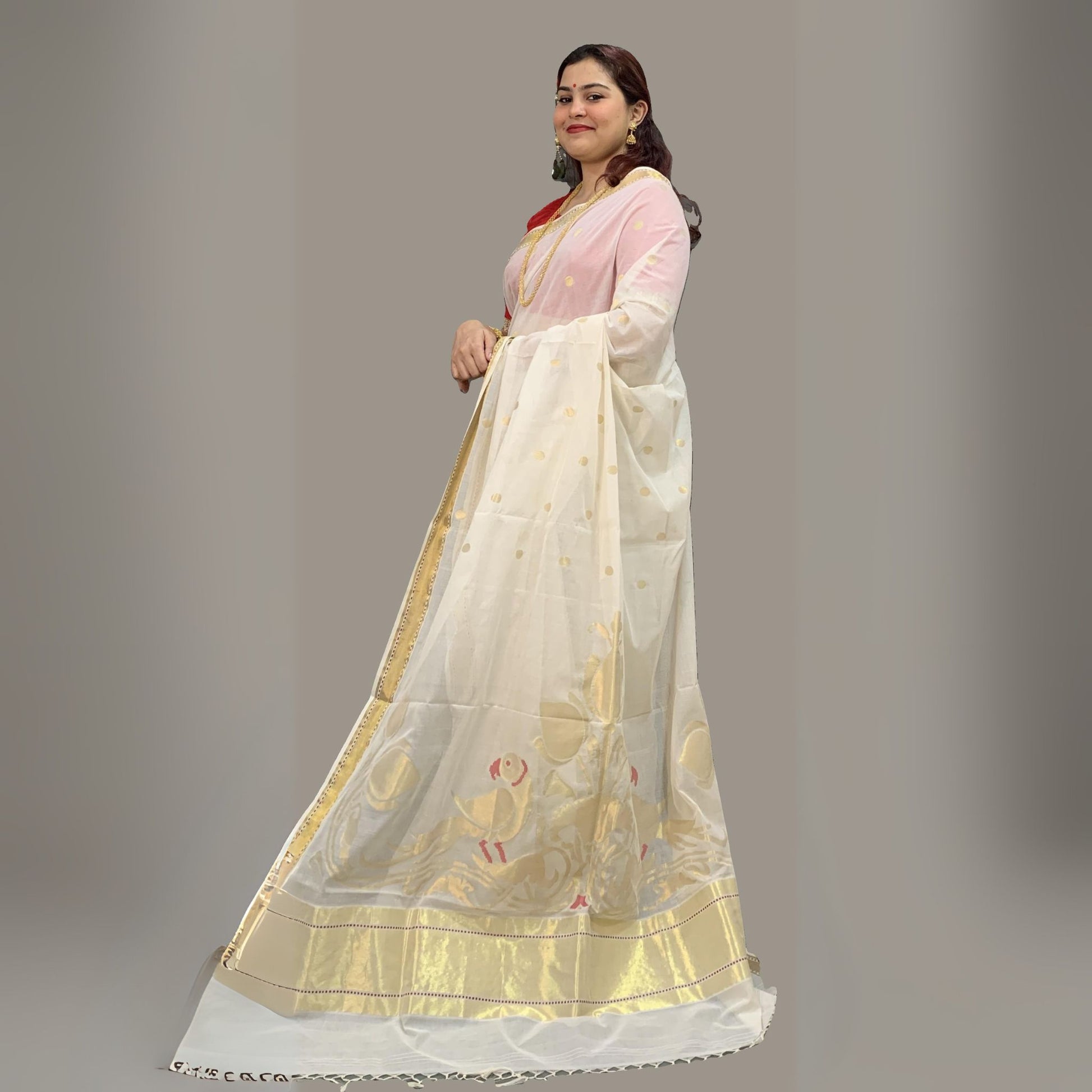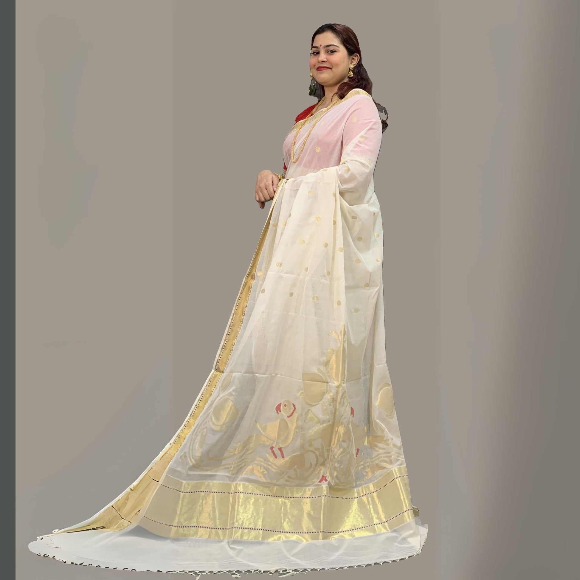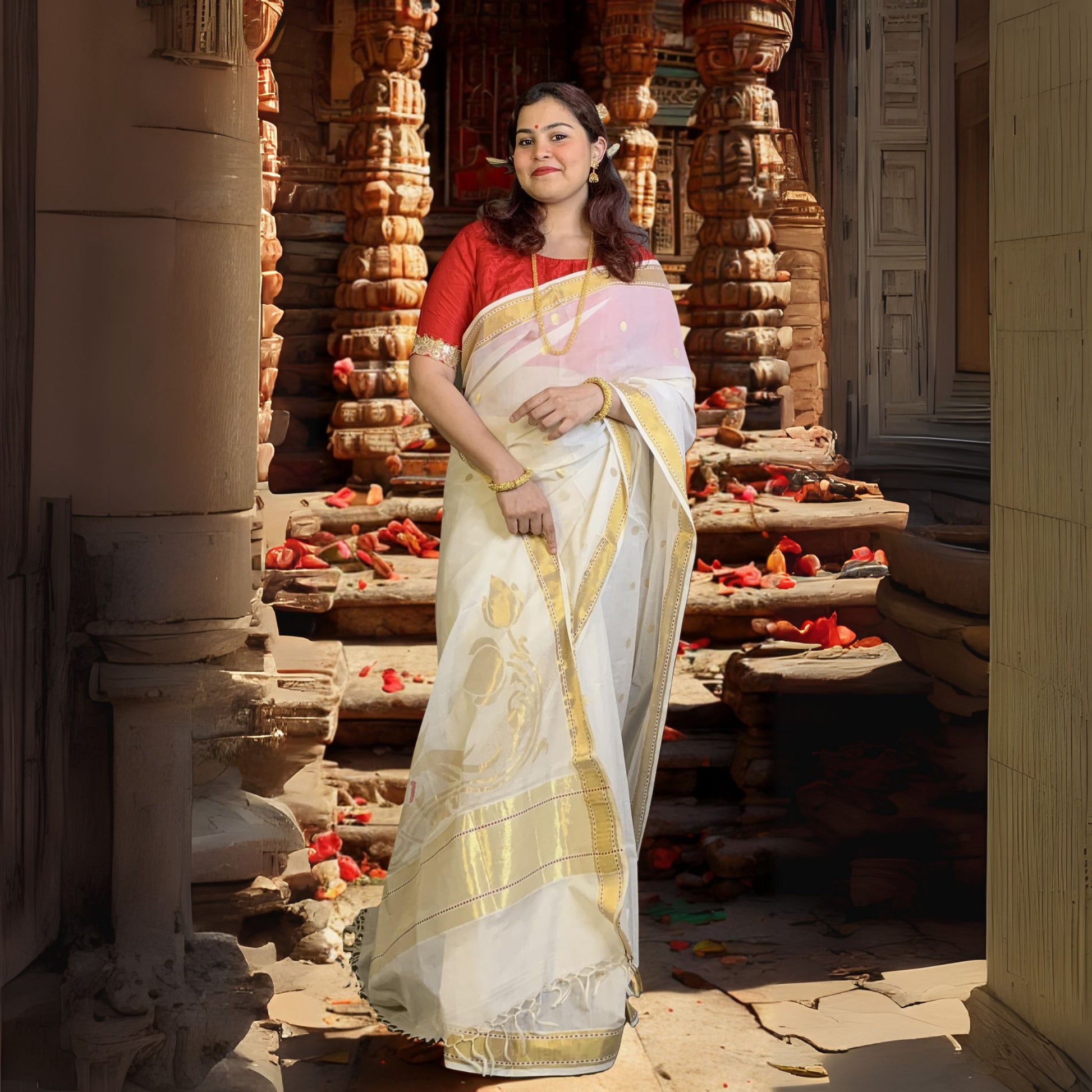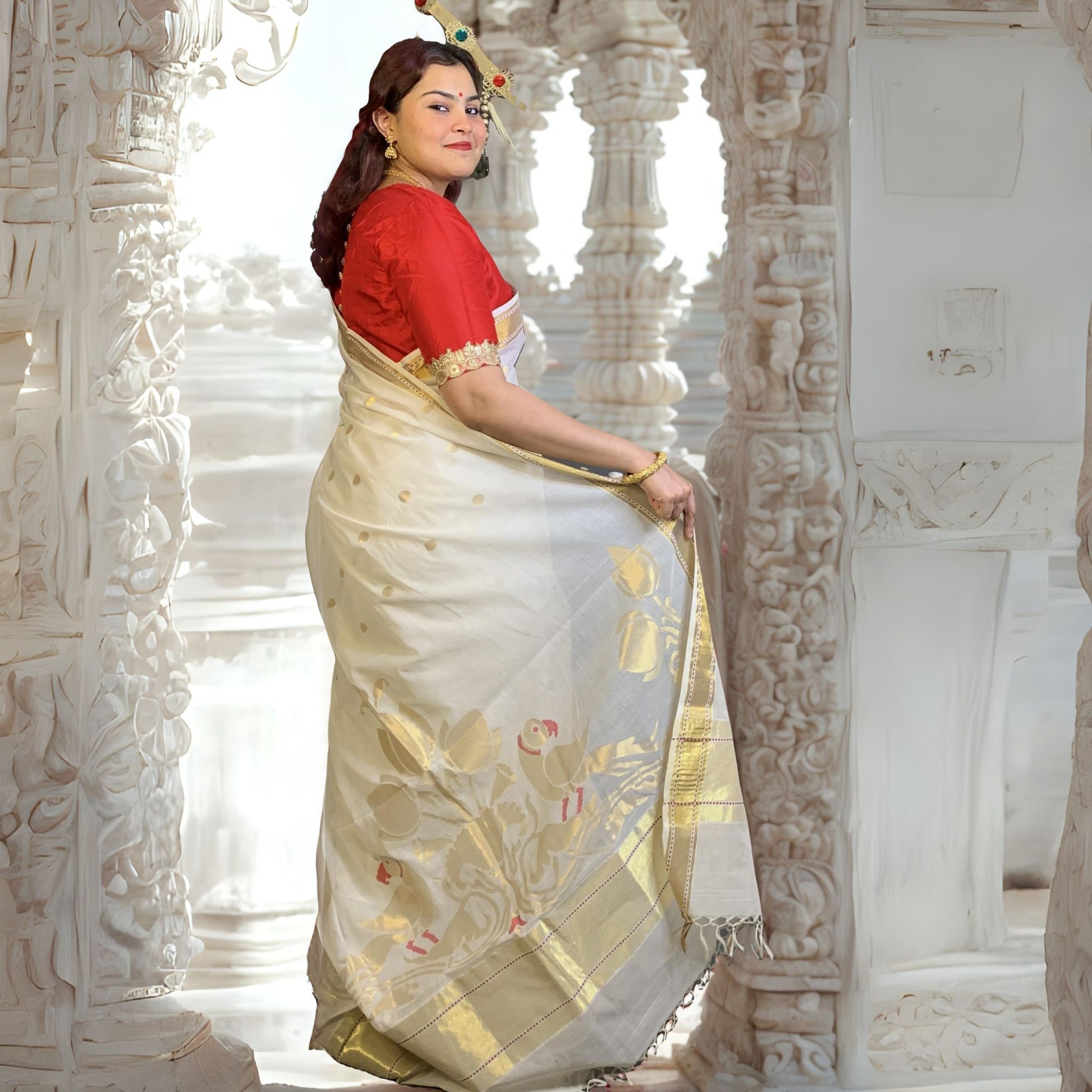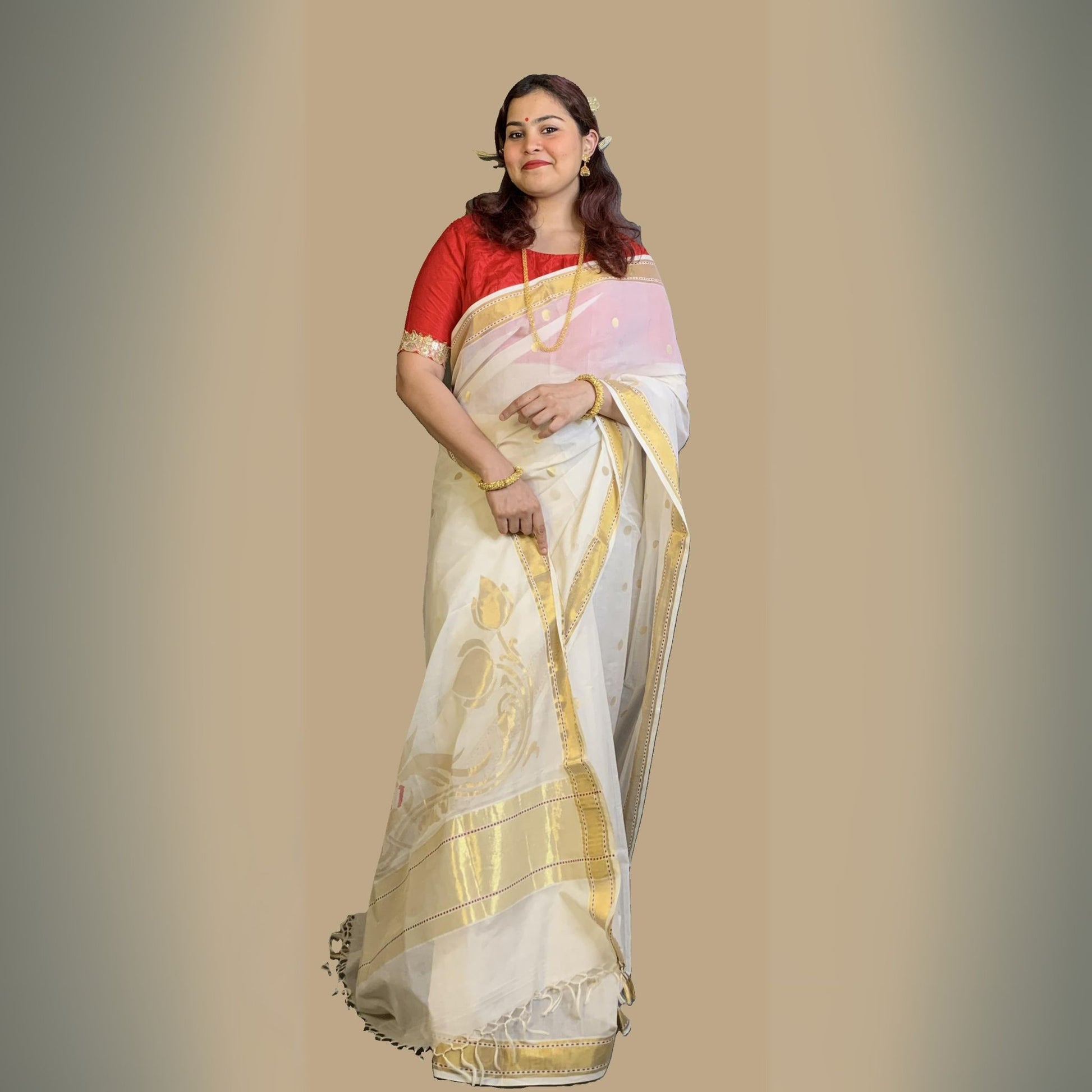 Colour &Description : Experience the timeless elegance of the Pure Cotton Off White Jamdani Saree. Handwoven with over 100 counts of pure cotton, this saree features intricate golden zari butas all over the saree with a thin golden zari and Red border. A stunning handwoven Jamdani pallu in Golden Zari is the most beautiful part of the saree. it takes months to weave the saree. A revival of an age-old art from Venkatgiri, South India, this saree is truly a masterpiece, crafted by a certificate of merit holder recognized by the Government of India.