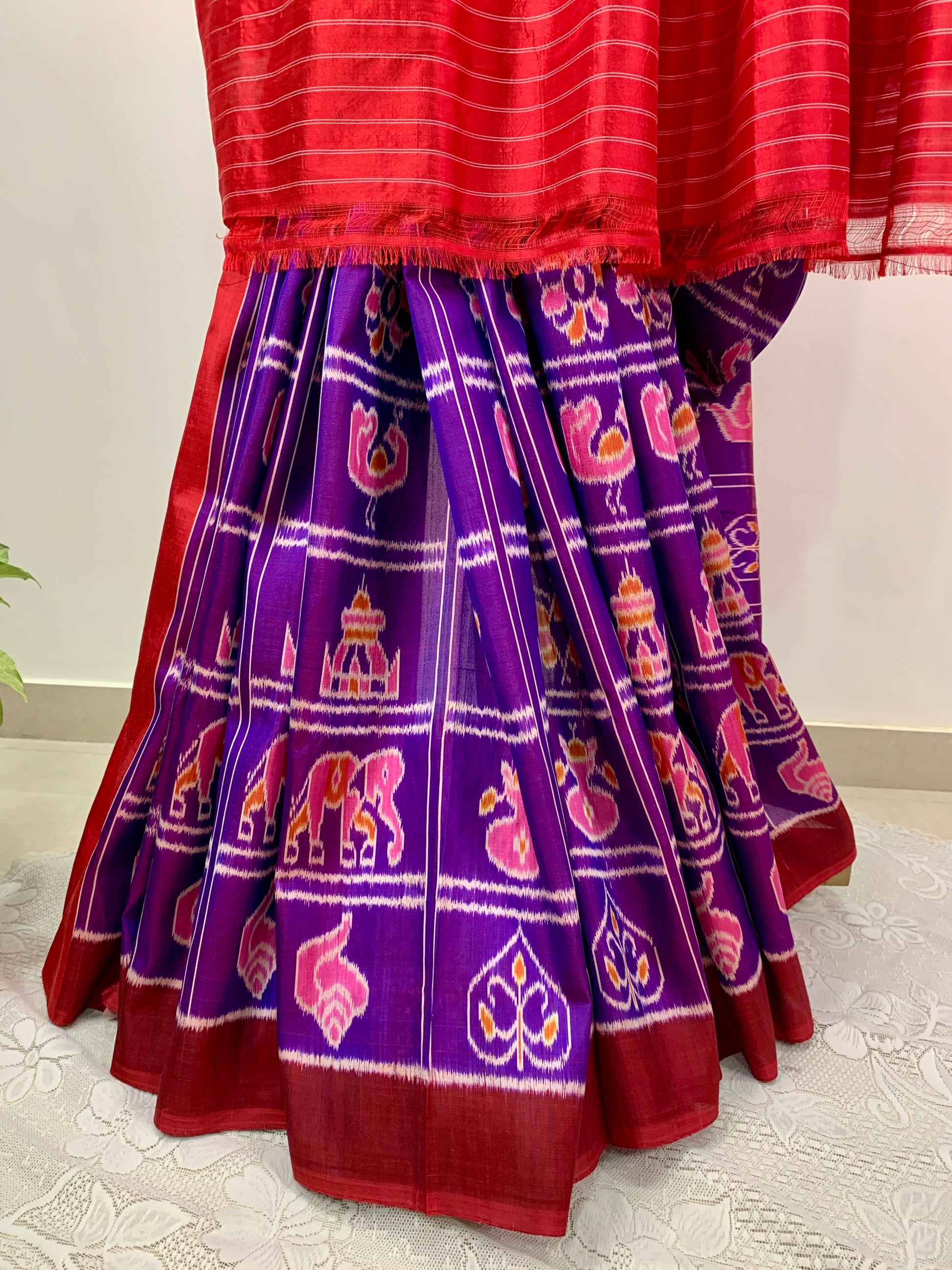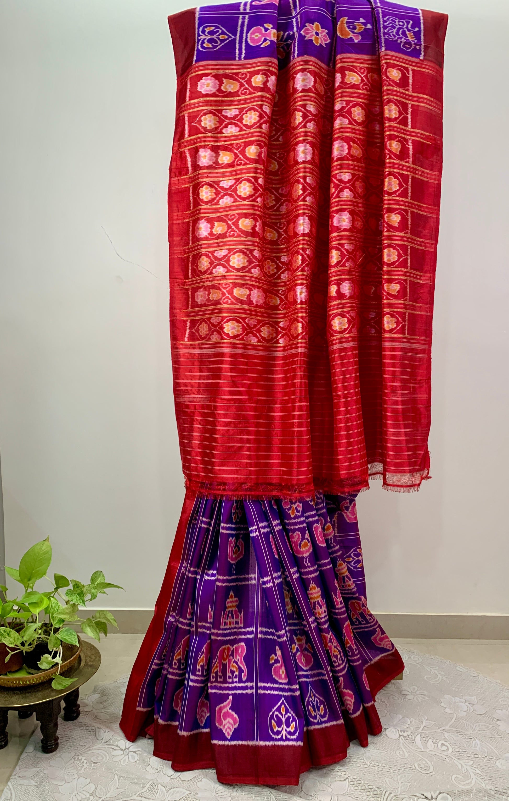 Color & Design: Experience the elegance and tradition of Sambalpuri sarees with our Pure Silk Sambalpuri Saree. Adorned with intricate motifs and colorful designs, this Purple saree features a Red border and detailed pallu, showcasing the craftsmanship of Sambalpur Khandua Patta. Add a touch of tradition to your wardrobe with this beautiful saree.